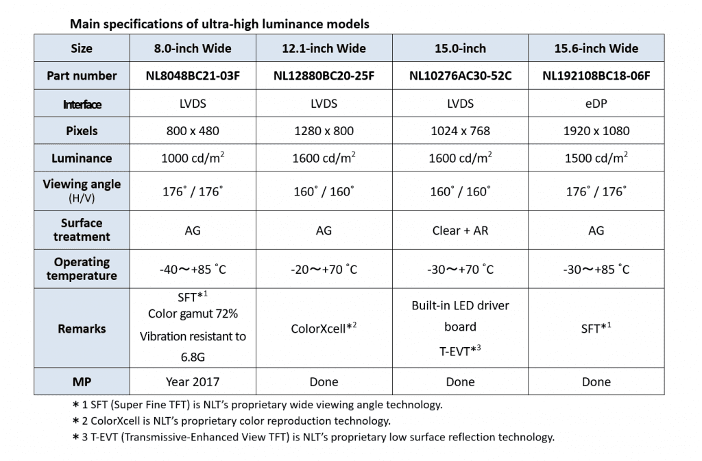 NLT Technologies will continue to enhance its product line-up that meets various operating conditions with wide ranges of display sizes and resolutions in order to meet the various demands of customers.